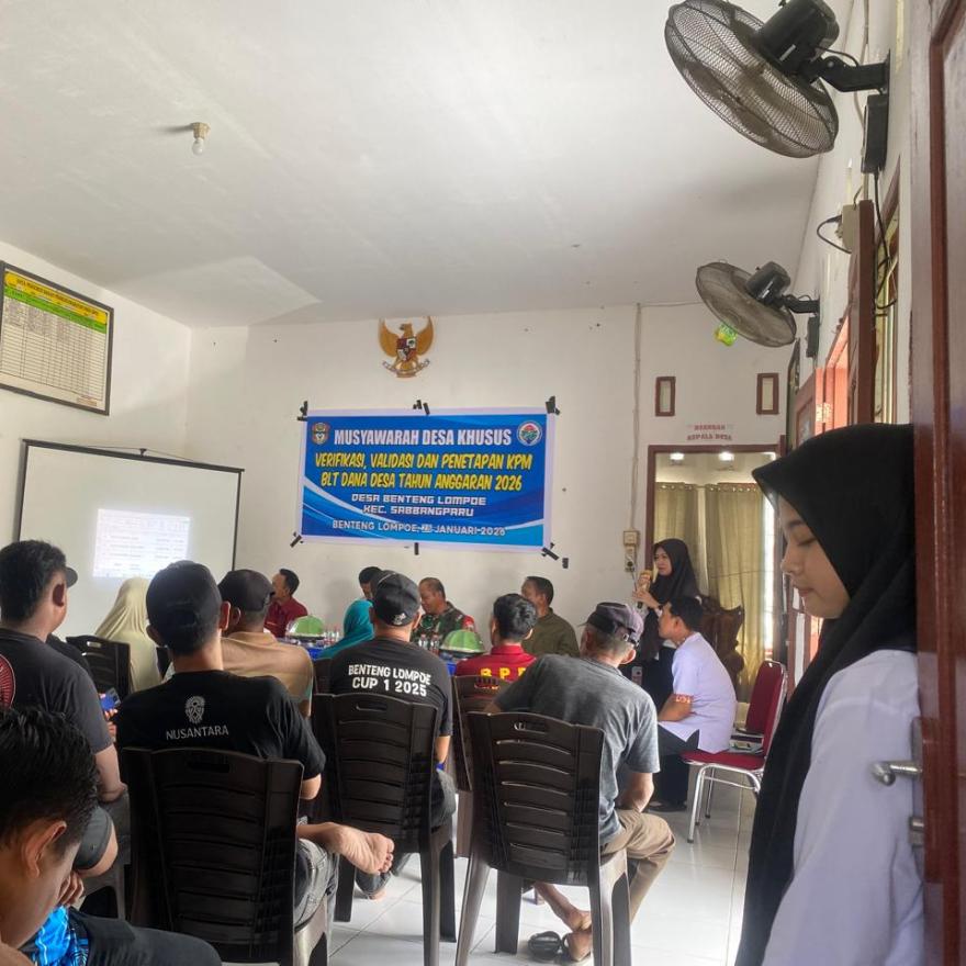 Benteng Lompoe — Pemerintah Desa Benteng Lompoe melaksanakan Musyawarah Desa Khusus (Musdesus) dalam rangka verifikasi, validasi, dan penetapan Keluarga Penerima Manfaat (KPM) Bantuan Langsung Tunai (BLT) Dana Desa Tahun Anggaran 2026. Kegiatan tersebut berlangsung di Aula Kantor Desa Benteng Lompoe, Rabu (28/1/2026).