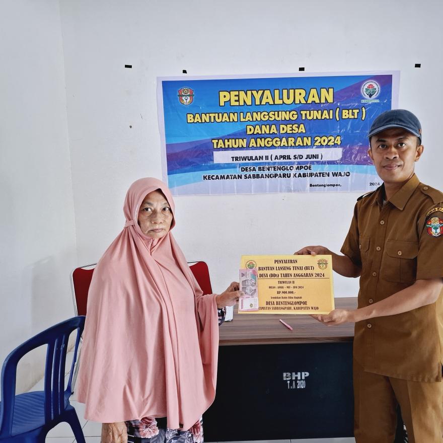 Benteng Lompoe - pada Jumat (06/05/2024) Pemerintah Desa Benteng Lompoe, Kecamatan Sabbangparu, Kabupaten Wajo melaksanakan Penyaluran Bantuan Langsung Tunai (BLT) Dana Desa Triwulan II Tahun 2024, yang meliputi bulan April, Mei, dan Juni, bertempat di Aula Kantor Desa Benteng Lompoe.