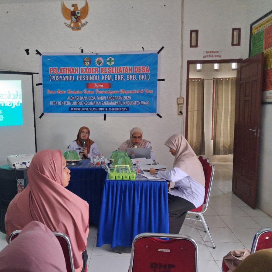 Benteng Lompoe – Rabu (15/10/2025) Pemerintah Desa Benteng Lompoe menggelar Pelatihan Kader Kesehatan Desa Tahun Anggaran 2025 selama dua hari, mulai Selasa hingga Rabu (14–15 Oktober 2025), bertempat di Kantor Desa Benteng Lompoe, Kecamatan Sabbangparu, Kabupaten Wajo.