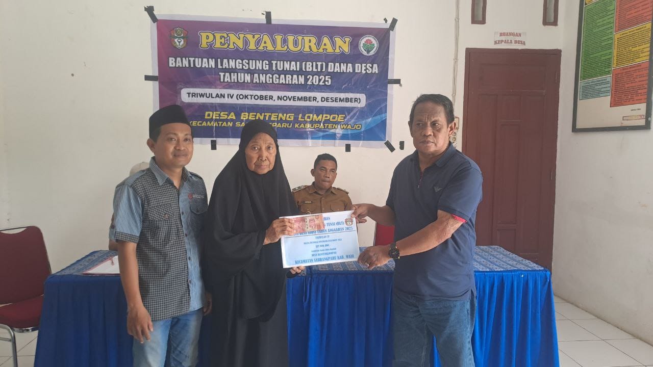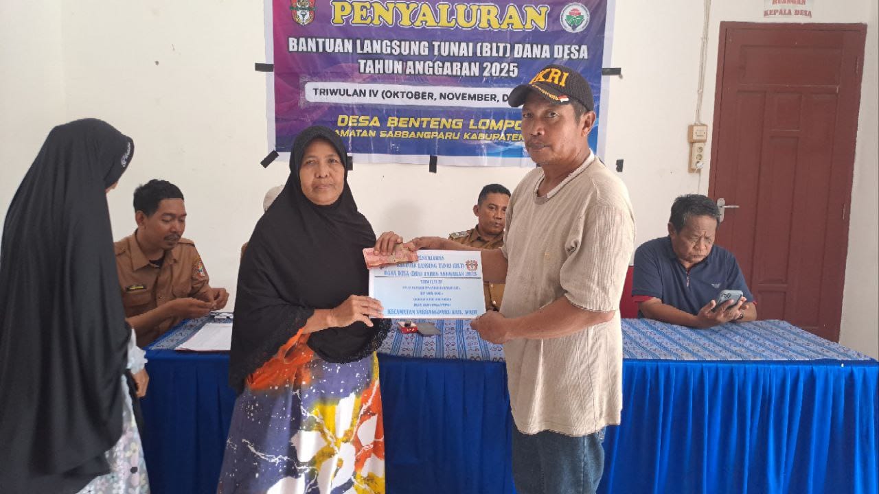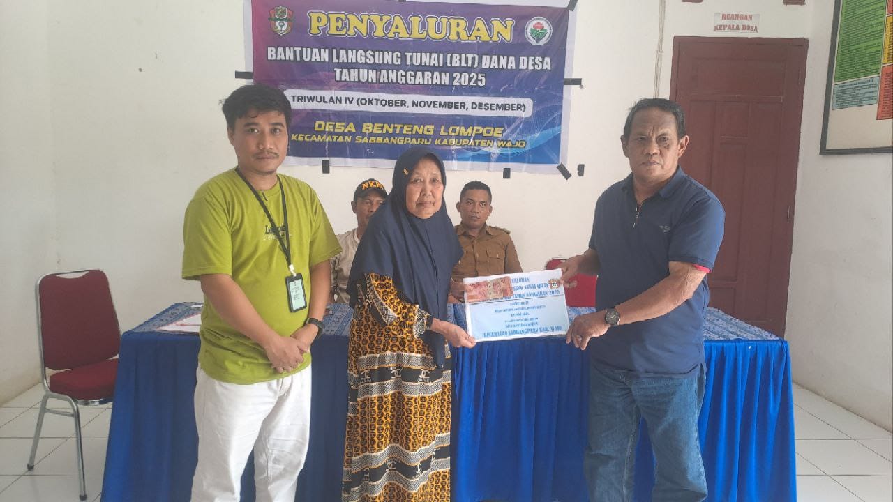 Benteng Lompoe - pada Senin (03/11/2025) Pemerintah Desa Benteng Lompoe, Kecamatan Sabbangparu, Kabupaten Wajo melaksanakan Penyaluran Bantuan Langsung Tunai (BLT) Dana Desa Triwulan IV Tahun 2025, yang meliputi bulan Oktober, November, dan Desember, bertempat di Aula Kantor Desa Benteng Lompoe.